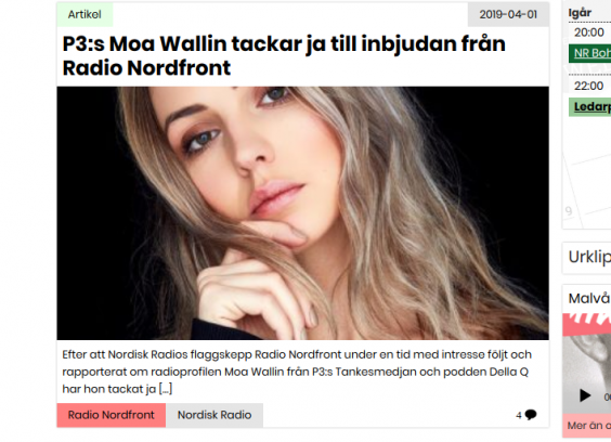 Efter att Nordisk Radios flaggskepp Radio Nordfront under en tid med intresse följt och rapporterat om radioprofilen Moa Wallin från P3:s Tankesmedjan och podden Della Q har hon tackat ja […]